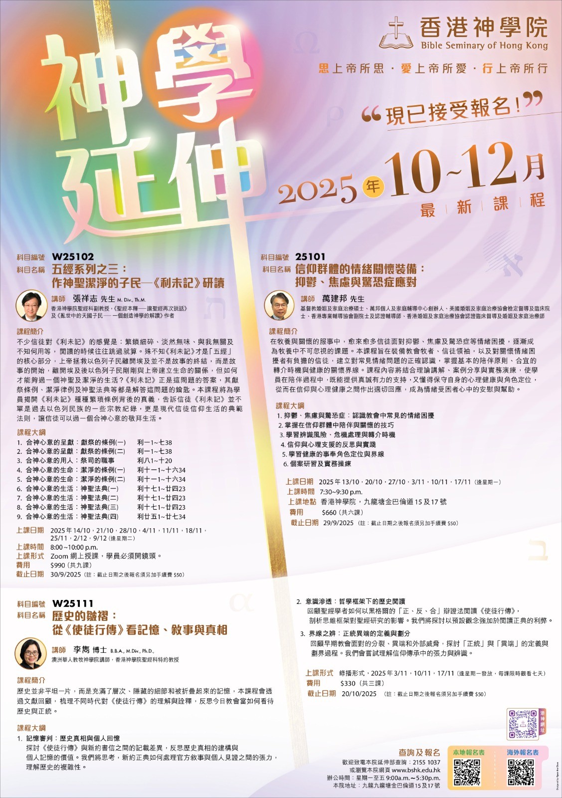 在牧養與關懷的服事中,愈來愈多信徒面對抑鬱、焦慮及驚恐症等情緒困擾,逐漸成為牧養中不可忽視的課題。本課程旨在裝備教會牧者、信徒領袖,以及對關懷情緒困擾者有負擔的信徒,建立對常見情緒問題的正確認識,掌握基本的陪伴原則、合宜的轉介時機與健康的關懷界線。課程內容將結合理論講解、案例分享與實務演練,使學員在陪伴過程中,既能提供真誠有力的支持,又懂得保守自身的心理健康與角色定位,從而在信仰與心理健康之間作出適切回應,成為情緒受困者心中的安慰與幫助。